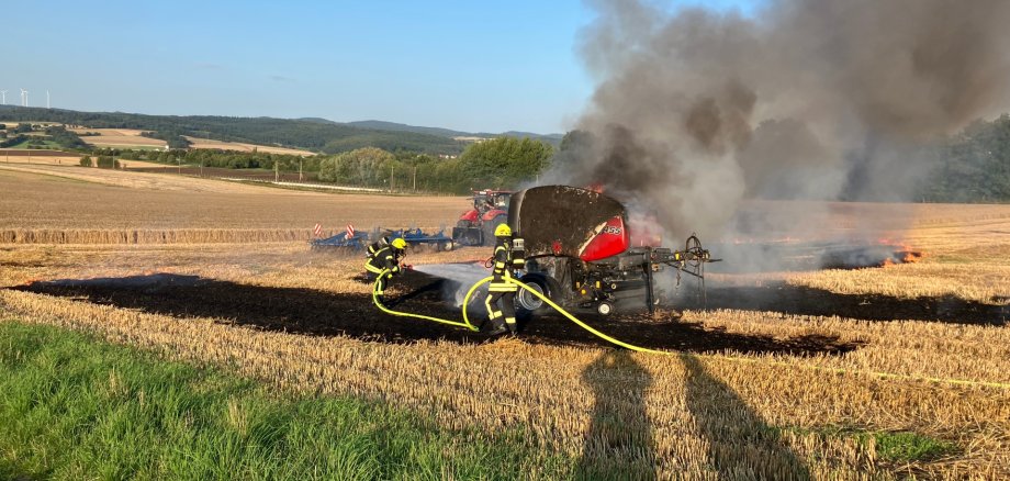 Eine Rundballenpresse befand sich im Vollbrand. Das Feuer hatte sich bereits auf den angrenzenden Stoppelacker ausgebreitet. Die Brandbekämpfung erfolgte unter Atemschutz mit einem C-Rohr.
