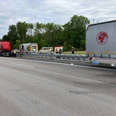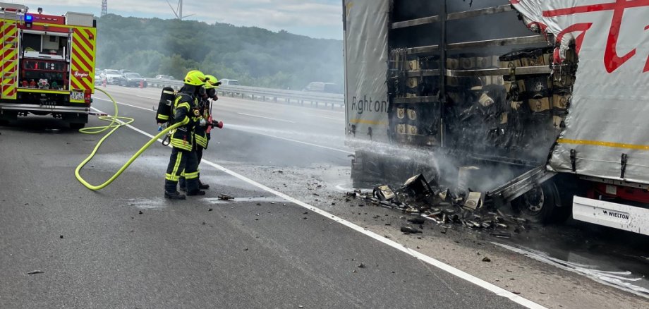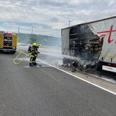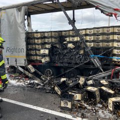 Beim Eintreffen der Feuerwehr stand der Auflieger eines Lkw im Bereich der Achsen in Brand. Das Feuer hatte sich bereits auf das Fahrgestell und die Ladung ausgebreitet. Die Zugmaschine war bereits vom Auflieger getrennt worden. Polizei und Rettungsdienst befanden sich bereits vor Ort. Die Ladung bestand aus Weizenbier, verpackt in Kunststoffkästen.